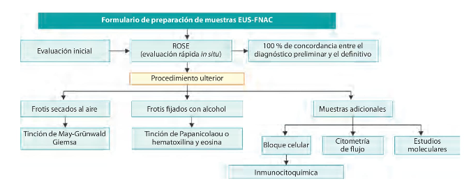 La evaluación inmediata del material aspirado (ROSE) permite verificar su calidad y evitar muestras no representativas. Posteriormente, pueden aplicarse diversas técnicas auxiliares como: