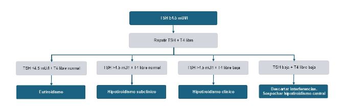 - TSH elevada + T4 normal → hipotiroidismo subclínico
