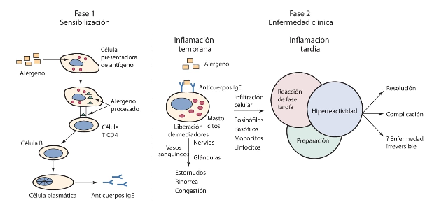 Las enfermedades alérgicas se producen cuando el sistema inmunitario responde de forma exagerada frente a sustancias normalmente inofensivas. En la hipersensibilidad tipo I, mediada por IgE, la exposición al alérgeno activa mastocitos y basófilos, con liberación de histamina y otros mediadores responsables de síntomas como congestión nasal, rinorrea, estornudos y broncoconstricción.