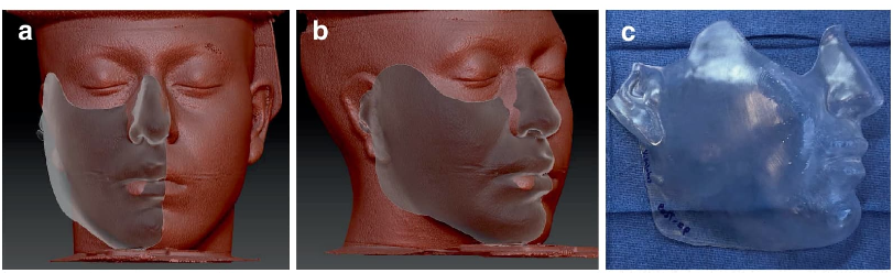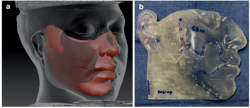 Con base en esta simulación se diseñan guías quirúrgicas que permiten identificar las zonas con déficit de volumen. Estas guías incluyen contenedores volumétricos que definen las diferencias de volumen y permiten cuantificarlas en centímetros cúbicos. Además, se extienden hacia estructuras como la nariz, el trago y el mentón para asegurar una correcta colocación durante el procedimiento. Posteriormente, se imprimen en 3D con resina fotopolimerizable.